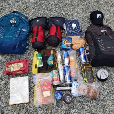 my youngest son and I laying out our gear for a 3 day hike into the mountains.